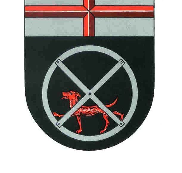 „In silbernem Schildhaupt ein durchgehendes geschliffenes rotes Kreuz. Darunter in Schwarz ein silbernes Rad, in dem ein roter Hund läuft.“